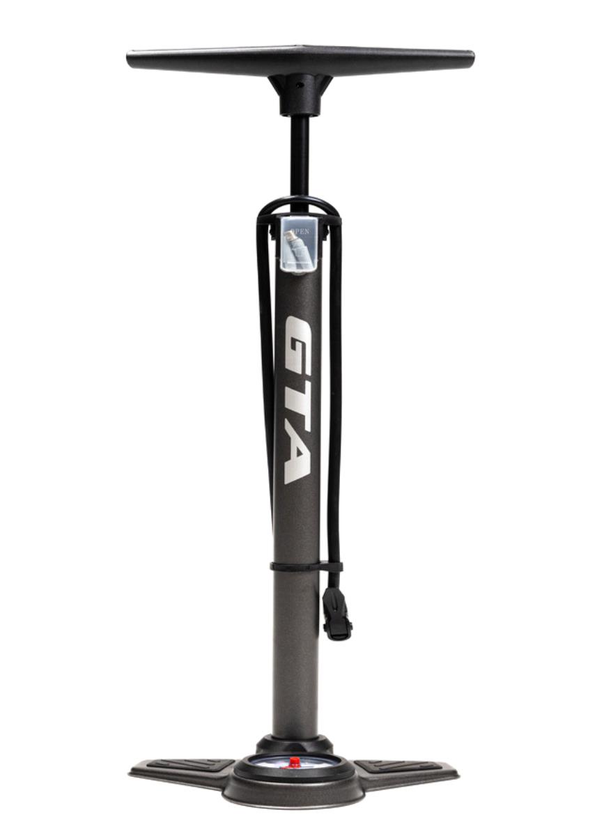 Bomba de Pé para pneus de bicicleta, marca GTA, modelo com Manômetro. Pressão máxima de 120psi. Compatível com uso com válvulas de bico fino (presta), grosso (schrader) ou Dunlop e bico para bola. Feita em aço.